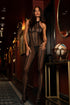 Sheer black mesh catsuit with body-contouring seam lines for a sculpted effect