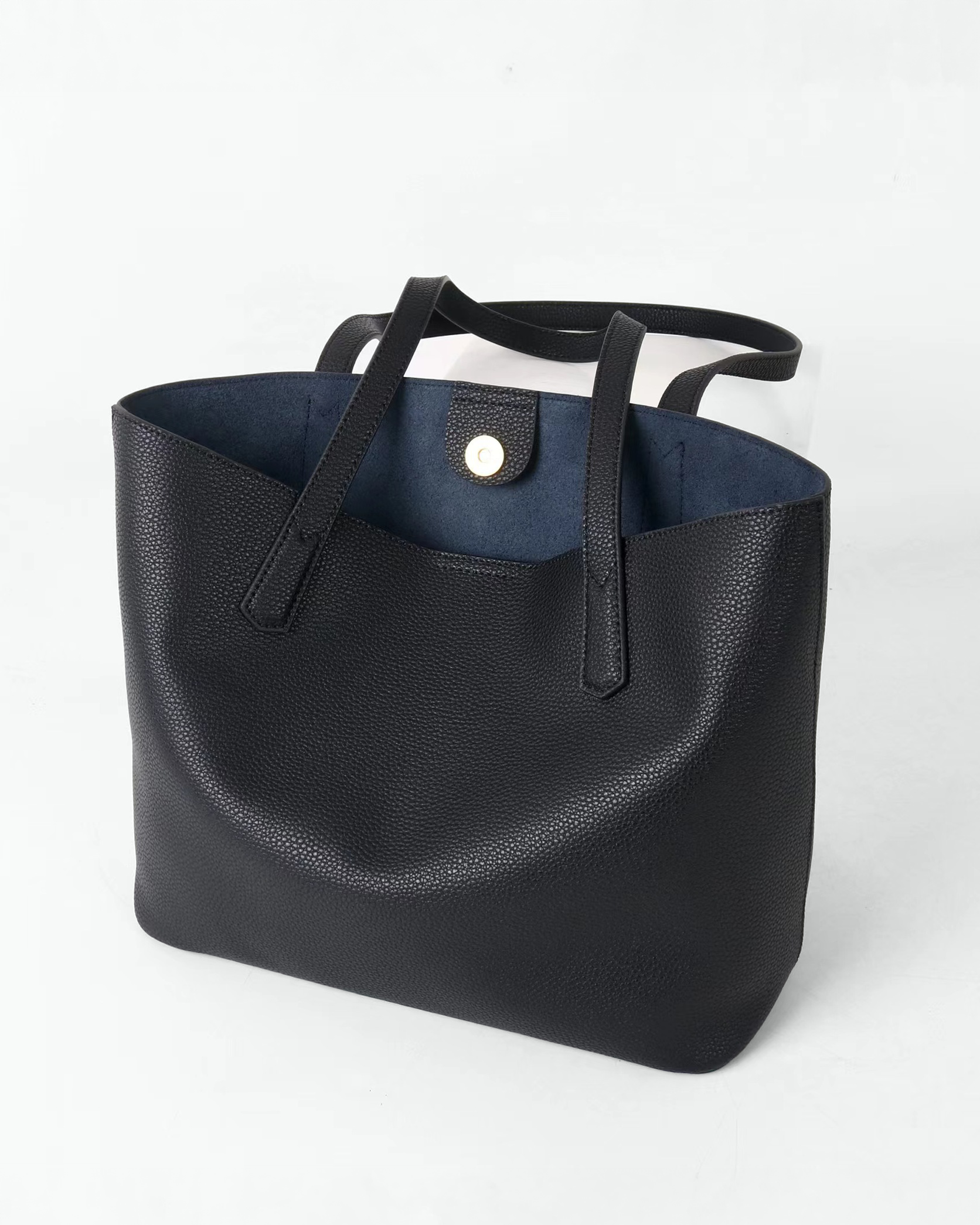 Spacious open interior with a secure snap closure and removable zip pouch for added organization. Designed to carry daily essentials while keeping valuables neatly contained.