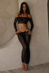 Sheer black mesh three-piece set with a bold, high-fashion silhouette