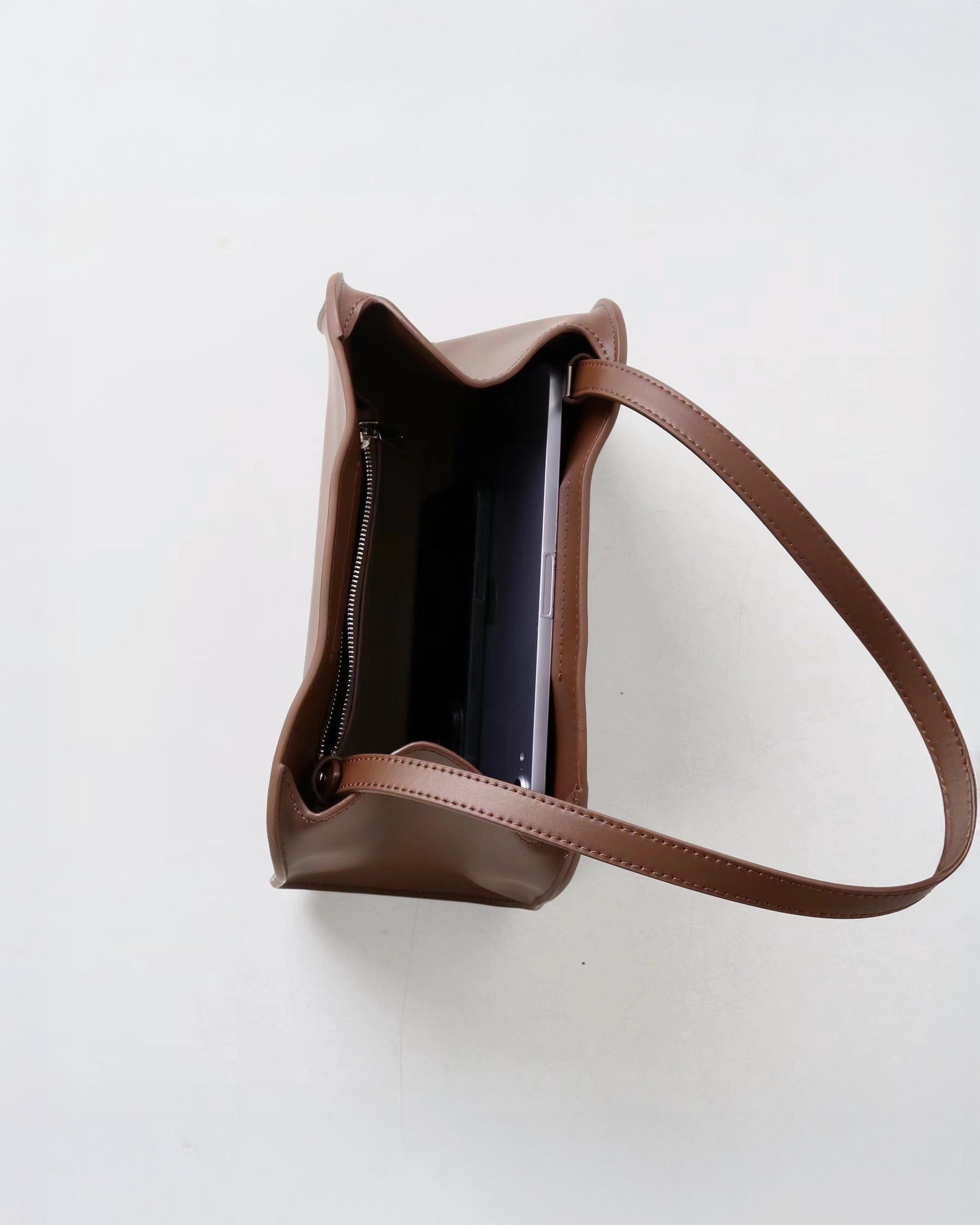 Slim interior profile with a secure zip compartment, ideal for essentials such as a phone, wallet, and keys. Streamlined layout ensures functionality without bulk.
